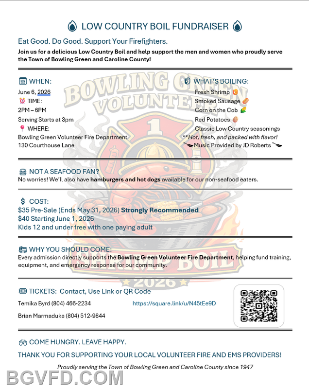 The Bowling Green Volunteer Fire Department is hosting a Low Country Boil for the community. Date: June 6, 2026 Time: 2:00 PM to 6:00 PM Serving begins at 3:00 PM Location: 130 Courthouse Lane, Bowling Green, VA 22427 Tickets are available for $35 in advance and $40 beginning June 1. Children ages 12 and under are admitted free with one paying adult. Get Your Tickets Here: https://square.link/u/N45tEe9D